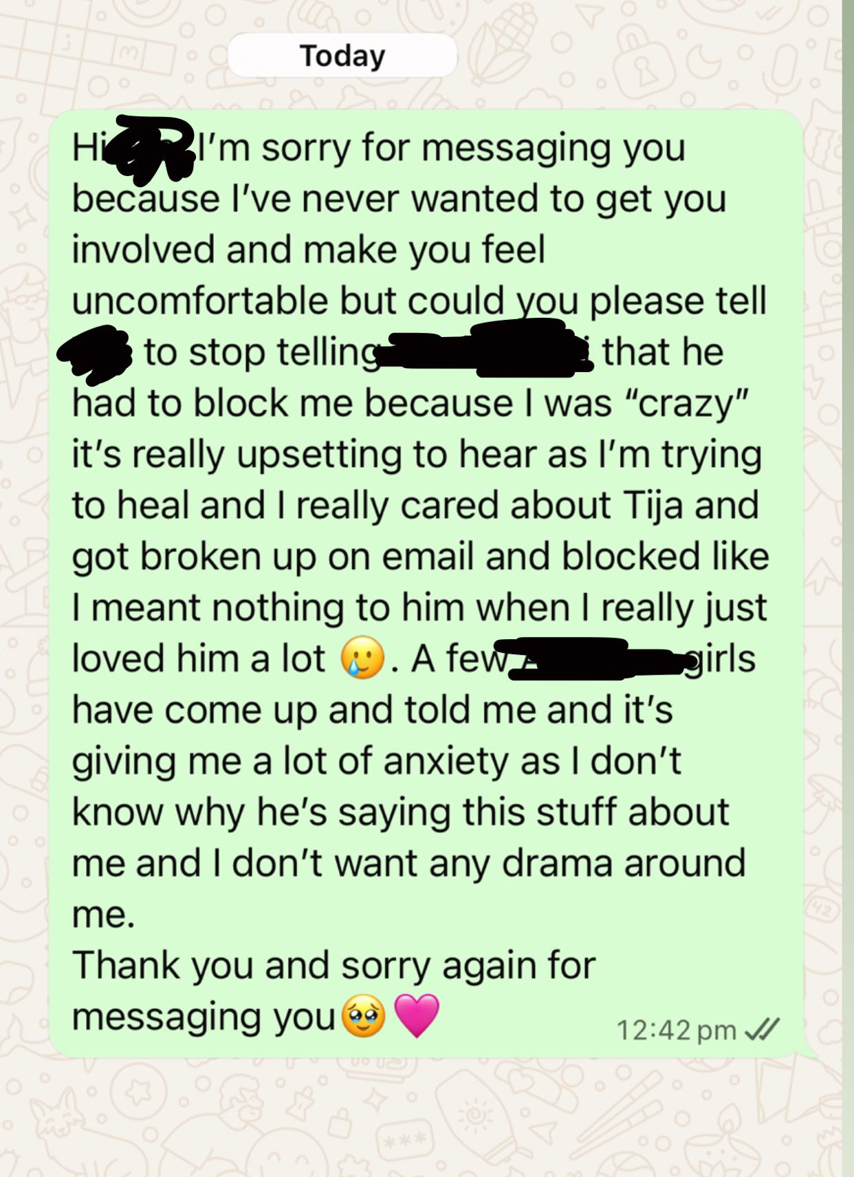Ex ended things with me on email, blocked me on everything before I could even respond. I really wanted us to work, even though he was quite mean to me while we were together 🥲 he never respected my boundaries or anything and was really avoidant and would block me and then blame me when I’d get anxious for him ghosting me. I found out that he’s calling me crazy to the one girl I had a boundary on, and she’s gone and told all of these girls that I mutually know and I feel so hurt 🥲 I messaged his sister but I feel like maybe I was too much and over crossed a boundary. I just am struggling and want us to move respectfully. Does this message seem okay or should I have just left it?